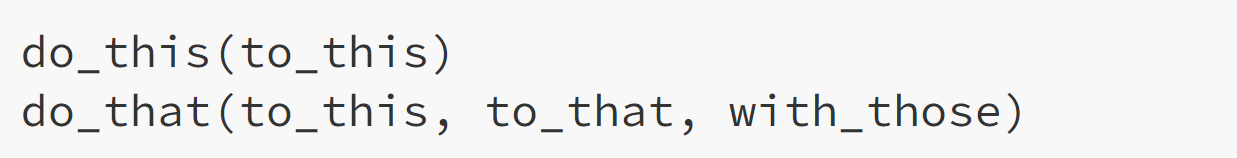 – Functions are (normally) verbs, followed by what they will be applied to in parentheses: