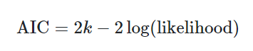 – You may see the idea of likelihood in future classes. For now, it suffices to know that the likelihood is a measure of how well a given model fits the data. Specifically, higher likelihoods imply better fits. Since the AIC score has a negative in front of the log likelihood, lower scores are better fits. However, k penalizes adding new predictors to the model.