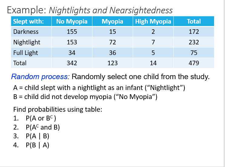 – P(A or \(B^c\)) = 0.484 + 0.286 - 0.165